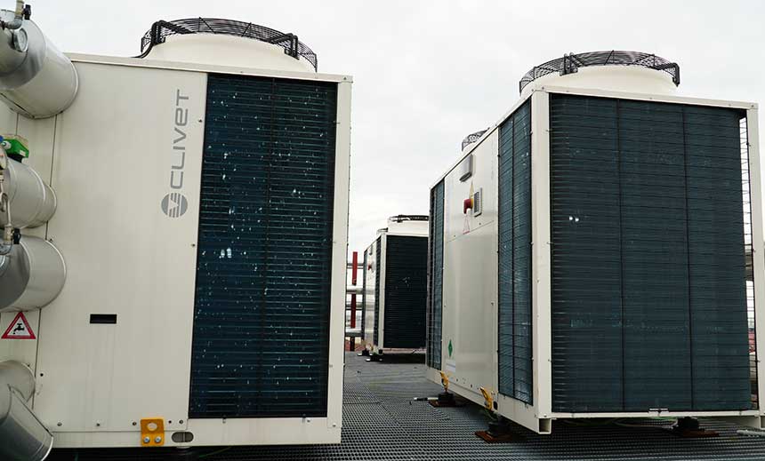 Upgrade von Klasse C auf Klasse A durch Ausstattung des Gebäudes mit Wärmedämmung und Ersatz des bestehenden Heizsystems durch ein komplettes Clivet-System auf der Grundlage von Mehrzweck-Wärmepumpen, Hochtemperatur-Wasser/Wasser-Wärmepumpen, Heizkesseln und dem Komfort- und Energiemanagementsystem Intelliplant.