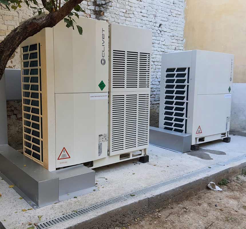 Gewählt wurde ein modernes VRF-System mit 2 MV6-Außengeräten, die mit einem Inverterverdichter mit EVI-Einspritztechnologie ausgestattet sind, der den Betrieb um bis zu 7 % modulieren kann und somit maximale Effizienz und Einsparungen garantiert, und 19 Innengeräten (Geräte für die Wandmontage, den Fußbodeneinbau bzw. in der Zwischendecke installierte kanalisierte Geräte), die mit verkabelten Steuerungen ausgestattet wurden, kompakt und leise sind und eine stets gleichmäßige Temperatur gewährleisten.